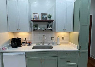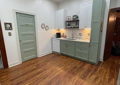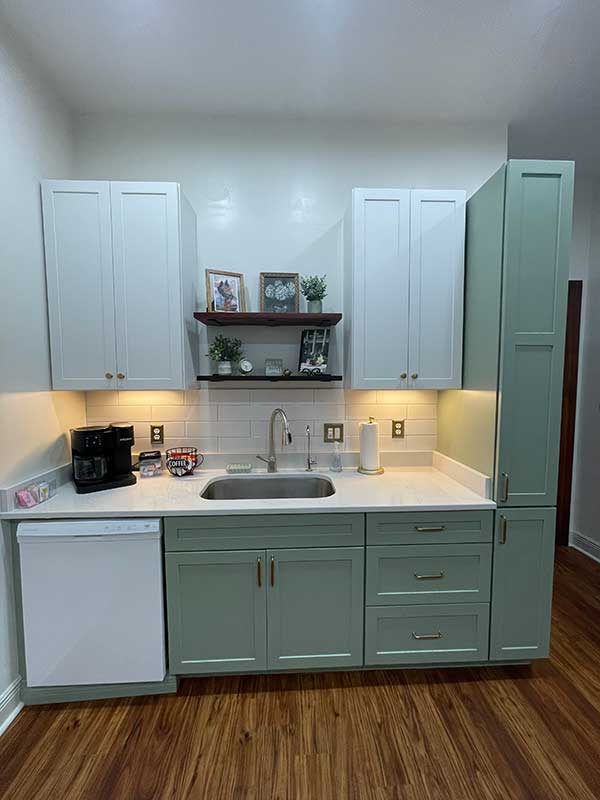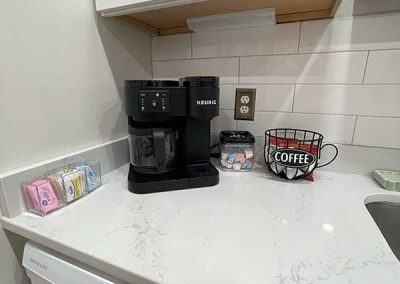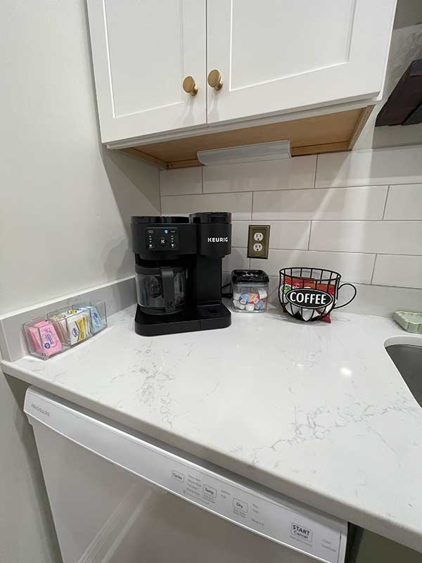 You’ll also find a Keurig single cup and pot coffee maker, coffee, creamer and sweetener, toaster, and Tea kettle for your morning routine.